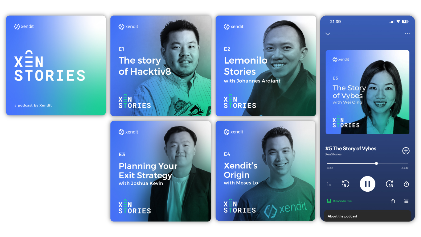 The first podcast, Xenstories, shares stories of startup founders, detailing how they built and managed their startups to achieve success. For this podcast, I developed visuals that adhered to Xendit’s visual guidelines, including the logo, album cover, and episode cover templates.